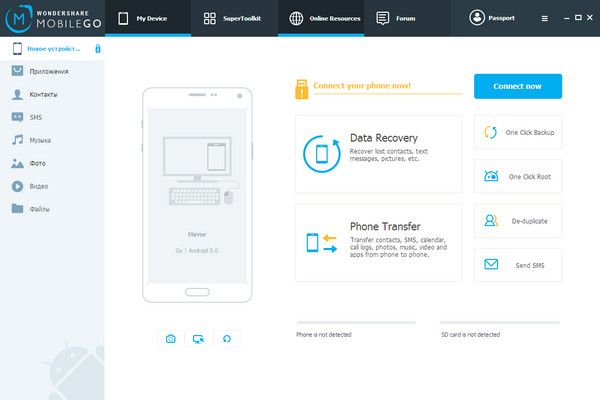 Wondershare MobileGo – универсальное приложение, которое позволяет управлять функционалом мобильных устройств на платформе Android и Apple iOS с помощью компьютера. При разработке данной программы авторами были учтены основные особенности операционных систем Android и iOS. Таким образом, быстродействие самой системы, высокая скорость обмена информацией между рабочей станцией и устройством дополняются данным приложением. Стоит отметить, что при подключение устройства к компьютеру программа позволяет принимать и отправлять как текстовые, так и звуковые сообщения.