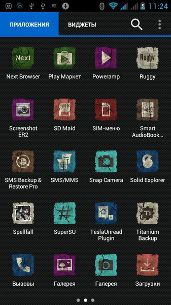 Разработчики GSeth выпустили замечательную тёмную тему оформления ко всем лаунчерам одновременно, назвав её Ruggy Icon Pack. Уже по весу файла становится понятно что она качественная, а если я скажу что ещё и обоев внутри нет и всё это место заняли две тысячи авторских иконок?! Это на самом деле так и после установки на свой телефон или планшет Вы не увидите ни одного не заменённого значка! Ну а обои, стилизованные и подобранные под тему, можно скачать из настроек - их почти полсотни штук на любой вкус и цвет.