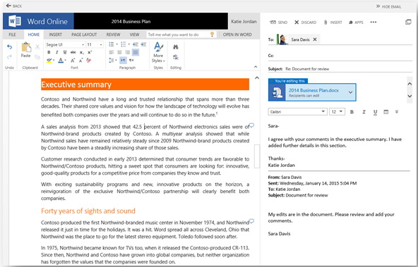 - Совместная работа: Exchange 2016 включает в себя новый подход к вложениям, что упрощает совместное использование документов и устраняет трудности, связанные с контролем версионности документов. В Outlook 2016 и Outlook Web App теперь есть возможность прикрепить документ в виде ссылки на SharePoint 2016 (в настоящее время в режиме просмотра) или OneDrive for Business.