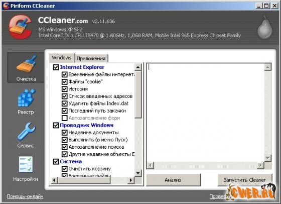 CCleaner - бесплатная программа для оптимизации работы Вашего компьютера. Данная утилита предназначена для чистки системного мусора. В ходе своей работы CCleaner (Crap Cleaner) ищет и удаляет временные и неиспользуемые файлы. Сюда относятся: cookies, история посещения сайтов в IE, временные файлы Интернета, строки поиска, файлы Корзины и т.д. Также поддерживается поиск временных файлов сторонних приложений: Firefox, Opera, Media Player, eMule, Kazaa, Google Toolbar, Netscape, Office XP, Nero, Alcohol 120, Adobe Acrobat, WinRAR, WinAce, WinZip, GetRight, Morpheus, Download Accelerator Plus, VirtualDub, ZoneAlarm и многих других.