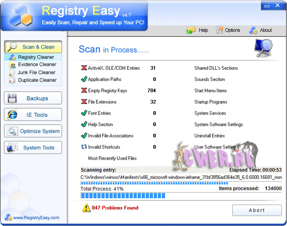 RegistryEasy - это программа, предназначенная для очистки реестра и оптимизации операционной системы Windows. Данная программа проверяет Ваш компьютер и легко находит и устраняет причины ошибок, вызывающих проблемы с компьютером. Проверяя системный реестр, программа Registry Easy определит ошибки, связанные с нехваткой загрузочных программ, нехваткой системных шрифтов, недействительными ярлыками, недостающими dll файлами, неверными инсталляциями программ, неверными драйверами устройств. Кроме того, обнаруженные ошибки могут быть связаны с отсутствием связей между файлами и недостатком файлов помощи. Позвольте программе RegistryEasy очистить Ваш реестр безопасно и эффективно!