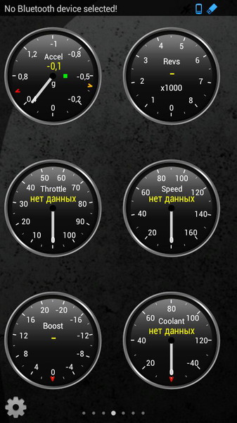 Когда программа подключилась к интерфейсу OBD-II, она начинает получать всю необходимую информацию. В приложении отображаются 7 экранов, с помощью которых вы будете в курсе текущего состояния автомобиля. Точнее, программа отображает параметры работы двигателя. Если во время работы Torque загорелась лампочка check engine на панели приборов, то приложение может её выключить. Информацию, которую вы получаете, можно просматривать как в графиках, так в циферблатах и простых числовых значениях. Помимо встроенных виджетов можно использовать собственные. Алармы на различные значения у датчиков можно настроить самостоятельно. К примеру, для температуры охлаждающей жидкости, оборотов двигателя или текущей скорости. При желании можно загрузить расширенный набор параметров от производителя автомобилей. В любой момент вы можете просмотреть значение датчиков предыдущих проверок.