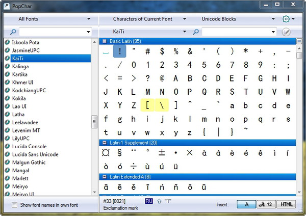 PopChar - утилита, представляющая собой всплывающее окно, которое может располагаться поверх всех остальных окон и выводить таблицу различных символов, которые пользователь может вставить в текст любого документа. Кроме стандартных букв и чисел, клавиатура имеет множество других знаков, применяющиеся повсеместно, но которые не всегда можно легко вставить в текст. Для использования многих из них, требуется запомнить сложные комбинации клавиш, о которых вы можете просто не знать. Вот почему программа PopChar так полезна. Она позволяет вам вставлять спецсимволы в свои тексты на ходу, не теряя времени на подбор различных комбинаций клавиш или поиск их в интернете. Просто с помощью мыши выберите необходимый символ, и он может быть скопирован куда угодно - будь то текстовый редактор или email клиент. Программа может быть запущена определенной комбинацией клавиш и закрывается немедленно, сразу после вставки символа.