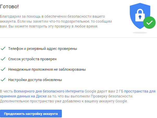 В честь Всемирного дня безопасного Интернета Google дарит каждому желающему 2 ГБ дополнительного пространства для хранения данных на Google Диске за выполнение Проверки безопасности.