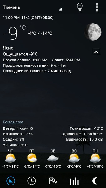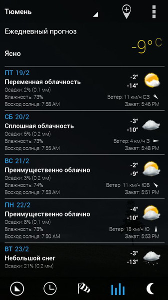- Подробная информация (восход солнца, закат, фазы луны, ветер, влажность и вероятность дождя).