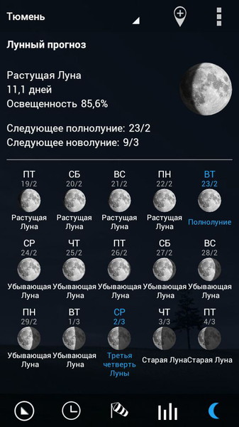 - Отображение текущих фаз луны.