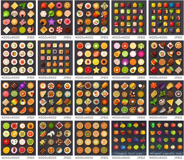 Качественные иконки в высоком разрешении с вкусной едой. Здесь вы найдёте пиццу, суши, роллы, овощи, фрукты, мясные деликатесы и другие вкусности. Есть пару сборников с полигональными иконками.