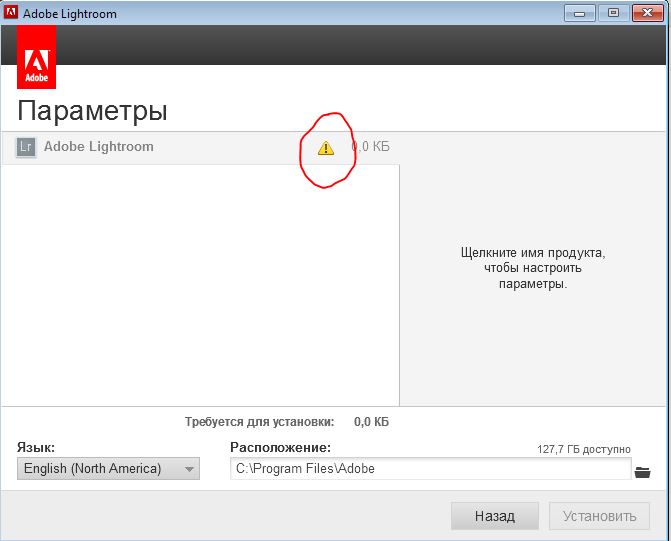 6. Реализована возможность выбора директории (папки) установки: вы увидите уведомление о неправильности пути - нажмите "Изменить" и укажите желаемый путь. Обратите внимание, что в связи с особенностями официального установщика к выбранному пути будет добавлено "Adobe\Adobe Lightroom Classic CC", поэтому в большинстве случаев стоит выбрать C:\Program Files\