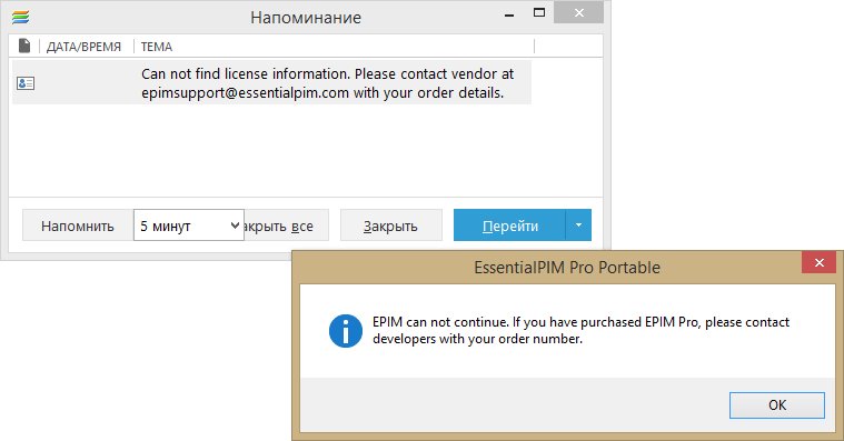 В какой-то момент начало вылезать напоминание обратиться на офсайт для подтверждения лицензии, после нескольких напоминалок с периодичностью 5-15 минут. EssentialPIM схлапывается. На разных компах и ОС одна и та же ситуевина. Примечательно, что пока не открываешь свою БД, то вроде лицензию не хочет. Как и где можно исправить в бд этот казус? С уважением и надеждой.