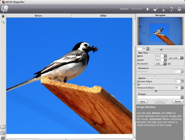 Magnifier — программа для изменения размера изображений без потери качества. С Magnifier можно не только уменьшить фотографии, а также получить увеличенное в десятки раз изображение высокого качества из маленькой картинки без артефактов и ореолов! Изменяя размер изображения, Magnifier восстанавливает границы и детали, борется с jpeg-артефактами.