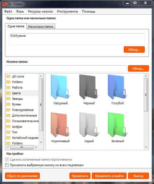 Программа Dr. Folder поможет заменить значки папок на альтернативные, чтобы сделать их более узнаваемыми, а также конвертировать файлы изображений в формат ICO. Конечно, можно настроить значки и без использования сторонних программ, но это трудоемкий и длительный процесс, который является одной из причин почему большинство людей используют стандартные значки каталогов Windows. Dr. Folder делает эту задачу намного проще, так как он позволяет обрабатывать несколько папок одновременно, и включает в себя довольно обширный набор значков.