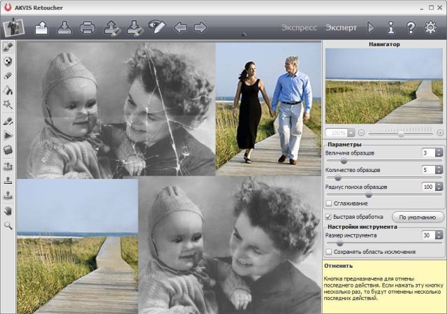 Retoucher не просто удаляет царапины, пятна, пыль и прочие дефекты с поверхности фото, он воссоздает недостающие фрагменты, используя соседние участки изображения. Программа эффективно восстанавливает поврежденные участки фотографий. Одним кликом вы избавитесь от царапин на фотографии, удалите ненужные надписи и даже нежелательные предметы.