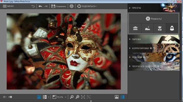 - Увеличение резкости фотографий с функцией добавления фокуса в один клик для портретов, а также макроснимкам.