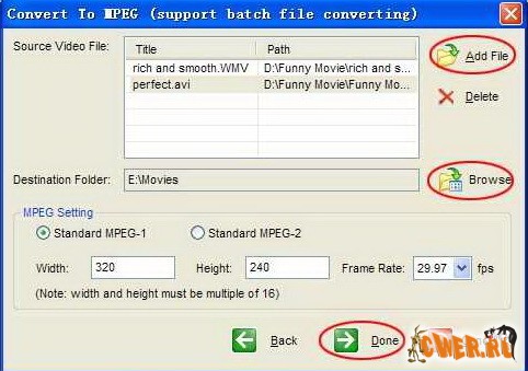 С помощью этой программы вы можете конвертировать видео файлы из одного формата в другой. Поддерживаются следующие форматы: AVI (DivX, XviD, MPEG-4...), MPEG (MPEG-1, MPEG-2), WMV/ASF, VCD/DAT и SVCD