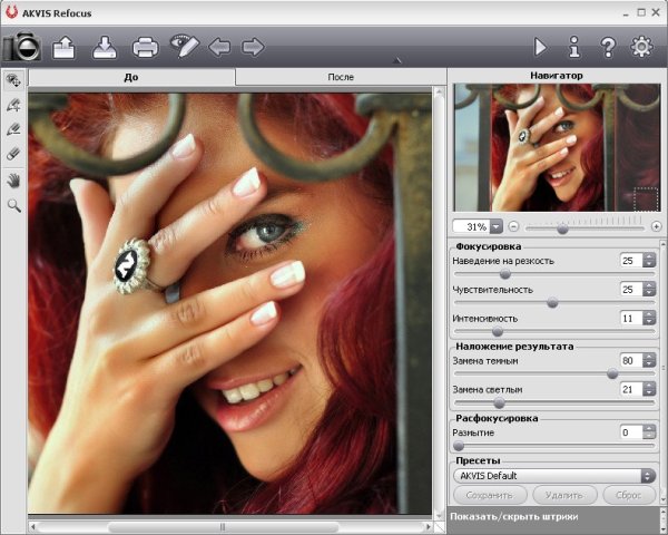 Refocus - программа и плагин для графических редакторов, который поможет улучшить резкость размытых, нечетких, расфокусированных фотоснимков, позволит исправить целое изображение или "сфокусироваться" только на определенном объекте, выделив его резкостью на фоне второстепенных элементов.