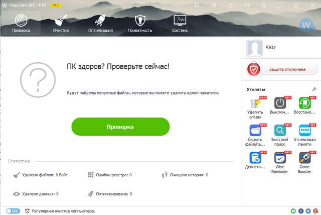 Wise Care 365 – программный пакет, предназначенный для оптимизации, настройки и очистки компьютера. Способен быстро и безопасно произвести очистку системного реестра, освободить место на диске, дефрагментировать реестр и жесткий диск, восстановить удаленные файлы, блокировать приложения путем установки пароля на запуск, оптимизировать оперативную память, редактировать список автозагружаемых приложений и многое другое. Имеются дополнительные опции скрытия и шифрования важных файлов или папок, оптимизация компьютера "в один клик" и работа по расписанию.