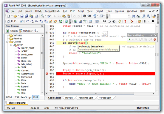 Rapid PHP - полноценный и быстрый редактор PHP, возможности которого выходят далеко за рамки среды обычного PHP редактора.Удобные возможности позволят Вам создавать и редактировать не только PHP, но и HTML, XHTML, CSS и JavaScript коды, в то время как интегрированные инструменты позволят Вам с легкостью проверять, многократно использовать, ориентироваться и форматировать Ваш код. Не важно являетесь ли Вы профессиональным разработчиком или просто энтузиастом, с редактором Rapid PHP Вы сможете справиться с поставленной задачей быстрее, сэкономить время и повысить продуктивность. Функции включают в себя подстветку синтаксиса, примеры кодов, подсказки PHP-функций, поиск и замену, ftp-клиент и многое другое. Имеет большое количество инструментов для проверки корректности кода, удобной навигации по коду, форматированию и т.д.