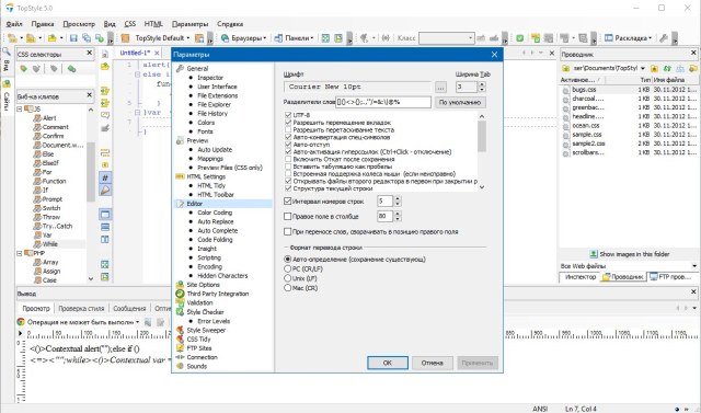 - В редакторе имеется подсветка синтаксиса CSS, ASP, PHP и HTML.