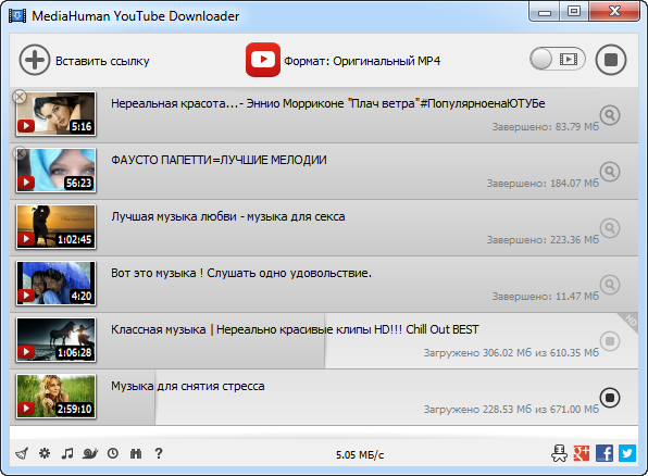 Программа поддерживает загрузку всех видео из плейлиста или канала. Также есть функция слежения за выбранным каналом или плейлистом с последующей загрузкой новых роликов. - Качество оригинала