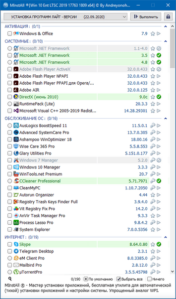 MInstAll Lite - сборник последних версий самых часто используемых в работе программ от Андрея Онохова. Процесс установки и регистрации программ и компонентов происходит без участия пользователя, после выбора необходимого софта. Образ помещается на DVD-диск 4,7 ГБ.