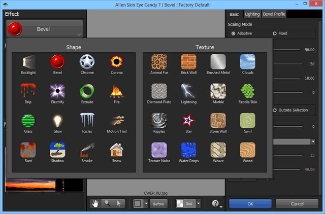 Eye Candy - один из самых лучших плагинов для Photoshop с многочисленными фильтрами и шаблонами для создания самых разнообразных природных эффектов за считанные минуты. Eye Candy состоит из 32 фильтров и более 1500 наборов различных заготовок для создания реалистичных эффектов создания огня, дыма, ржавчены, снега, льда и многого другого.