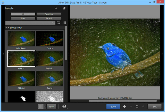 Alien Skin Snap Art - плагин для Adobe Photoshop, с помощью которого вы превратите свои фотографии в настоящие произведения искусства всего одним кликом мыши. Snap Art содержит достаточно большой набор предварительных заготовок, которые дают возможность трансформировать фото в картины, нарисованные маслом, углем, акварелью, цветными карандашами, ручкой и чернилами, пастельными мелками, а также в стиле комиксов, пуантилизма и импасто.