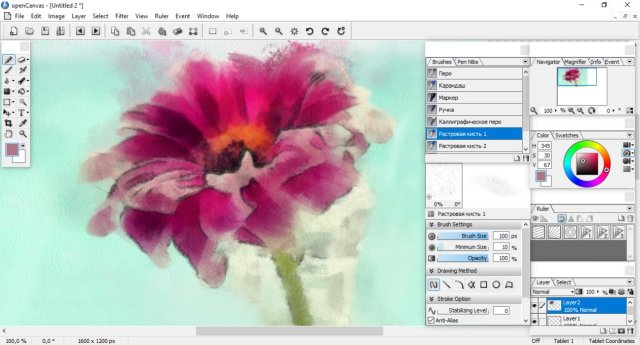 - Хорошо OpenCanvas сочетается с графическими планшетами, поскольку реагирует на нажатия пера и его наклон.