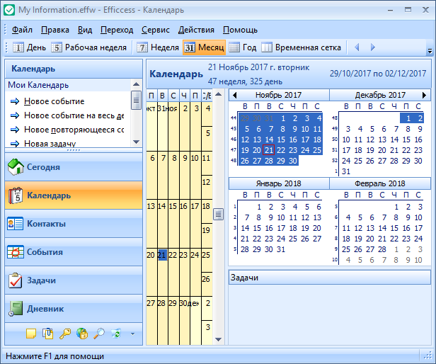 Efficient Efficcess — персональный информационный менеджер, который отслеживает назначенные встречи, а также содержит контакты, заметки, пароли и другие записи. Приложение несет в себе все стандартные функции органайзера, в том числе: повторяющиеся события, важные праздники, экспорт в HTML, управление задачами и напоминания. Входящий в состав продукта ежедневник содержит текстовый редактор с поддержкой rich text и изображений. Имеется встроенный менеджер паролей с генератором паролей. Поддерживается создание нескольких независимых профилей для каждого пользователя, а также выбор индивидуального интерфейса.