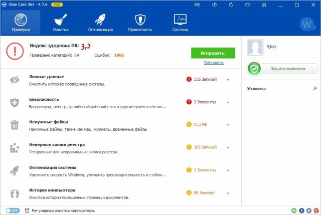 Wise Care 365 – программный пакет для оптимизации, настройки и очистки компьютера. Способен быстро и безопасно произвести очистку системного реестра, освободить место на диске, дефрагментировать реестр и жесткий диск, восстановить удаленные файлы, блокировать приложения путем установки пароля на запуск, оптимизировать оперативную память, редактировать список автозагружаемых приложений и многое другое.