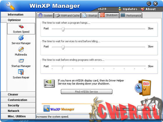 Программа предлагает простейший способ оптимизации, настройки и ускорения системы Windows XP. Сочетает в себе больше чем 30 различных утилит, дает доступ к сотням скрытых настроек для улучшения производительности и безопасности, очистки реестра и удаления мусора, оптимизации сети для ускорения Интернет соединения, создания копии данных из Outlook Express, управления папками обмена, а также другие разнообразные утилиты.