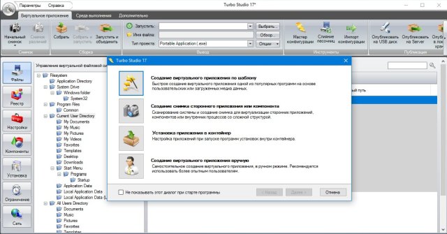 Turbo Studio — мощная программа для виртуализации приложений не требующих установки (создание Portable программ). Portable приложения не требуют установки внешних компонентов, библиотек, перезагрузок ПК, прав администратора, являются полностью изолированными от других системных приложений, а также могут запускаться с переносных носителей.