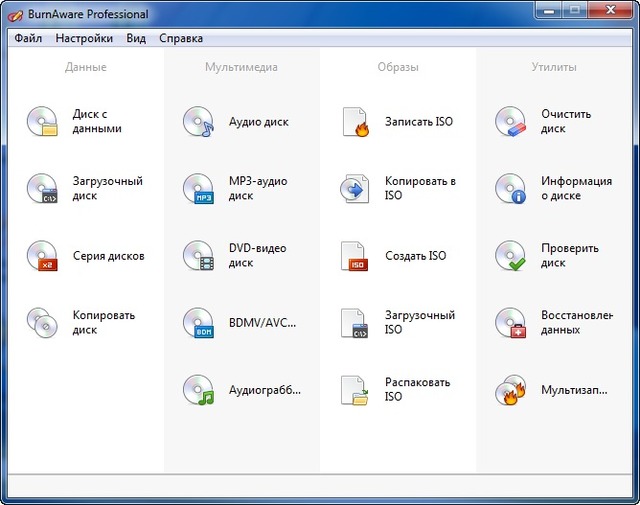 BurnAware — компактная и простая в использовании программа для записи файлов на CD, DVD, Blu-Ray и HD-DVD диски. Поддерживает работу с любыми типами оптических дисков (включая CD-R/RW, DVD-R/RW, DVD+R/RW, BD-R/RE, HD-DVD-R/RW и DVD-RAM) и аппаратными устройствами записи. Есть возможность создания образов, записи мультисессионных дисков, проверки записанного содержимого.