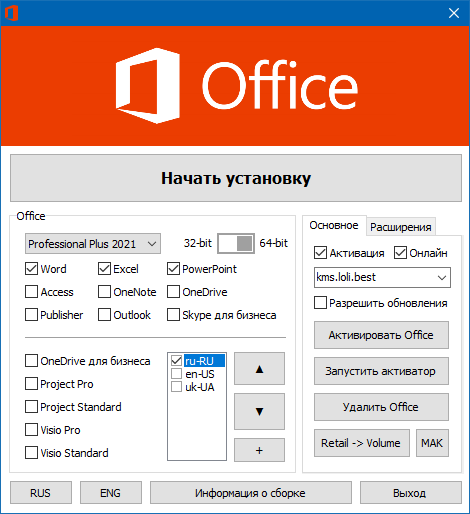 Утилиты -> Office RETAIL=>VL -потом> Активировать Office