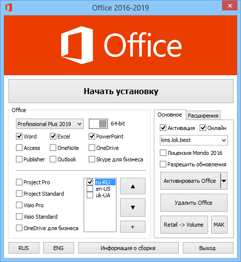 Re: "•Улучшено: Office 2016 объединён с Office 2019. •Обновлено: активатор AAct 3.9.6"