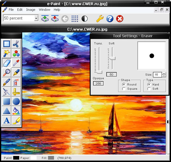 Alchemy Mindworks e-Paint - это простая и удобная программа для создания и редактирования графики. Позиционируется как отличная замена стандартному MS Paint из поставки Windows. Поддерживаемые форматы: BMP, PCX, TGA, JPG, GIF и PNG. В программу входят различные инструменты выделения, антиэлайзинг (сглаживание) нарисованных фигур и текста, галерея фильтров обработки изображений от очень простых до захватывающе привлекательных, работа с несколькими файлами одновременно, наборы кистей, пошаговая отмена выполненных действий, функции зума (увеличения изображения), интуитивный интерфейс, благодаря которому вам даже не понадобиться документация, позволяет улучшить изображение, редактируя цветовые и тоновые характеристики и т.д.