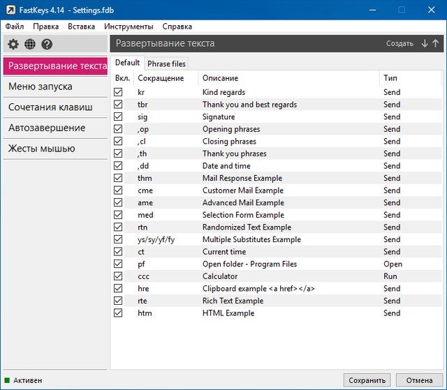 • Кроме того, программа позволяет присвоить горячей клавише любой текст. Эта возможность окажется очень полезной тем, кто часто использует стандартные фразы при составлении текстовых документов, в переписке или при заполнении различных веб-анкет. Например, при нажатии Ctrl+Alt+З в текст может вводиться фраза Здравствуйте . Отдельной комбинации клавиш можно присвоить ввод в текст текущих даты и (или) времени.