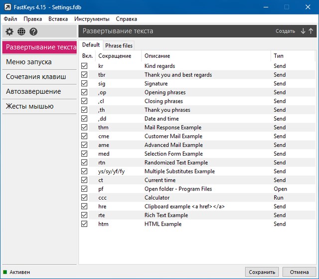 - Кроме того, программа позволяет присвоить горячей клавише любой текст. Эта возможность окажется очень полезной тем, кто часто использует стандартные фразы при составлении текстовых документов, в переписке или при заполнении различных веб-анкет. Например, при нажатии Ctrl+Alt+З в текст может вводиться фраза Здравствуйте . Отдельной комбинации клавиш можно присвоить ввод в текст текущих даты и (или) времени.