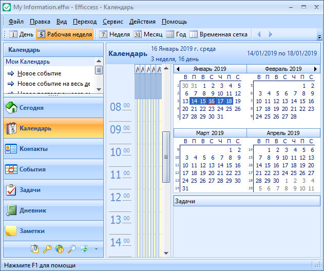 Efficient Efficcess — персональный информационный менеджер, который отслеживает назначенные встречи, а также содержит контакты, заметки, пароли и другие записи. Приложение несет в себе все стандартные функции органайзера, в том числе: повторяющиеся события, важные праздники, экспорт в HTML, управление задачами и напоминания. Входящий в состав продукта ежедневник содержит текстовый редактор с поддержкой rich text и изображений. Имеется встроенный менеджер паролей с генератором паролей. Поддерживается создание нескольких независимых профилей для каждого пользователя, а также выбор индивидуального интерфейса.
