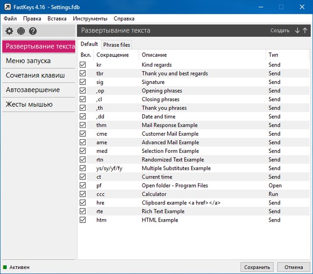 - Кроме того, программа позволяет присвоить горячей клавише любой текст. Эта возможность окажется очень полезной тем, кто часто использует стандартные фразы при составлении текстовых документов, в переписке или при заполнении различных веб-анкет. Например, при нажатии Ctrl+Alt+З в текст может вводиться фраза Здравствуйте . Отдельной комбинации клавиш можно присвоить ввод в текст текущих даты и (или) времени.