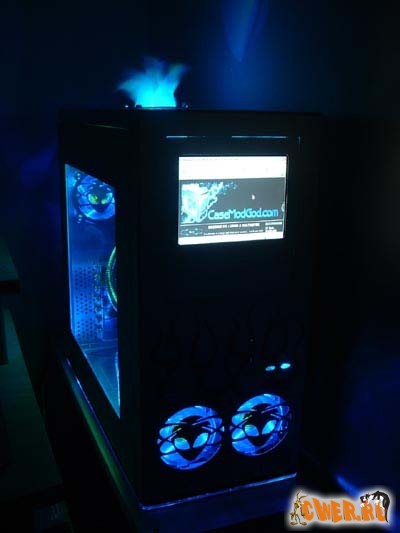 Для моддинга использовались два 80-мм вентилятора Cooler Master и 4 светодиодных пушки: две синих и две зеленых.