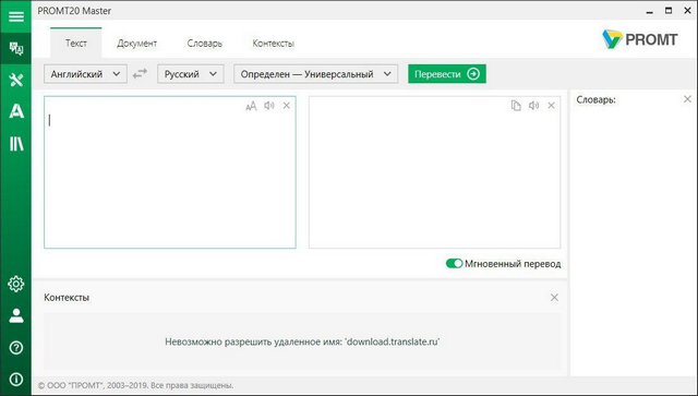 - Возможность использования тематических словарей PROMT и создание собственных словарей.