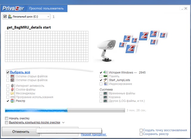 PrivaZer владеет уникальными для подобного класса программ способностями по очистке компьютеров с установленной системой Windows от ненужных файлов. С помощью модуля углубленного сканирования производится поистине полный анализ всей системы, в том числе и вторичных накопителей, внешних дисков а также подключенных к компьютеру накопителей любого вида. Приложение имеет особенный модуль, безвозвратно удаляющий файлы и обратную функцию – восстановление удаленных файлов. При углубленном режиме отображается перечень элементов сканирования. Некоторые папки можно исключить из очистки. Приложение удаляет следы файлов из мастер-таблицы файловой системы, журнала обращений к файловой системе, из Cookies, из файла системного реестра Index.dat, системной истории, истории Интернет-пейджеров, диспетчеров загрузки а также многих других компонентов системы. Приложение имеет возможность выполнить полное стирание файлов с накопителя без остатка а также возможности восстановления. Несмотря на великое количество подобных программ, этот пакет является одним из лучших в своем классе.