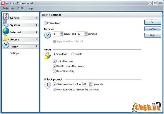 С помощью WinLock Вы можете управлять продолжительностью работы других пользователей на вашем компьютере. В момент достижения установленного времени происходит завершение работы Windows. Вы можете включить и выключить таймер из системной области в панели задач. Если WinLock включен, то для изменения настроек таймера необходим ввод пароля. Вы можете задать сообщение, появляющееся при загрузке операционной системы, а также звуковое оповещение.