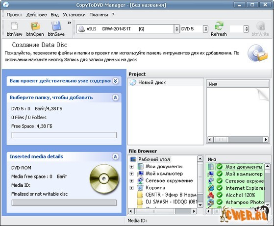 Большинство программ для работы с CD/DVD-RW работают таким образом, что составление содержания будущего диска происходит в главном окне программы. Особенность "Мeнeджepа CopyToDVD" в том, что, сразу после запуска этой программы вы увидите готовую компиляцию вашего диска. Создать ее можно еще до запуска утилиты, используя команду CopyToDVD Depot в контекстном меню. Работая с файловым менеджером, вы можете с ее помощью добавлять файлы, которые позже должны быть записаны. Это очень удобно, так как набирать содержимое диска вы можете постепенно, по мере накопления данных. Поэтому исключается возможность того, что вы забудете включить важный файл в компиляцию.