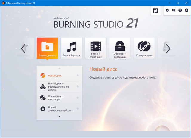 Ashampoo Burning Studio 21 может похвастаться новым интерфейсом, который бьёт прямо в цель! Вместо обычного меню мы добавили карусель, которая плавно переносит Вас от одного раздела программы к другому. Подробное описание функций теперь позволяет ещё проще найти именно то, что Вы ищите. А новая панель избранного позволяет Вам мгновенно получить доступ к Вашим любимым функциям! И кроме всего прочего, мы добавили кнопку, которая вернёт Вас в самое начало – на главную страницу программы, в независимости от того, где Вы находились. Не нравится новый подход? Нажмите кнопку и вернитесь к традиционному меню Burning Studio!