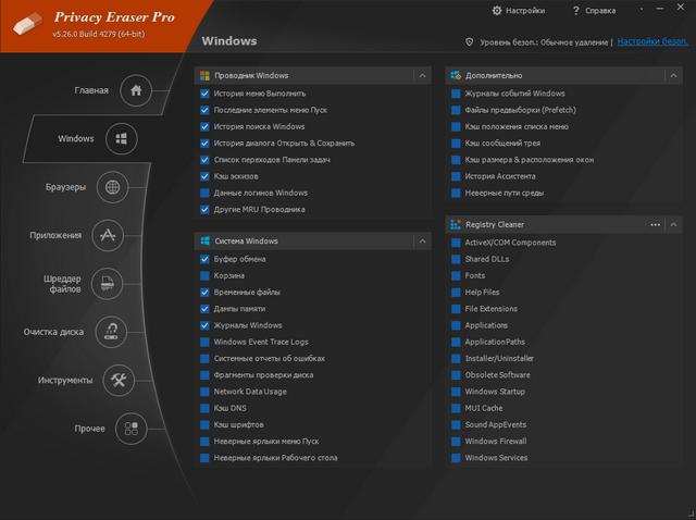 Privacy Eraser Pro - комплексный инструмент для защиты приватности путем удаления истории вашей активности в Интернете и других следов деятельности на ПК. Поддерживает основные параметры системы Windows, популярные браузеры и приложения.