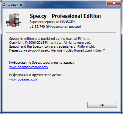 Speccy - программа для анализа аппаратной и программной части компьютера. Speccy отображает информацию об операционной системе и характеристики установленного железа. С помощью программы пользователь сможет узнать версию операционной системы, подробную информацию о процессоре, операционной памяти, винчестере, материнской плате, видео карте и др.Кроме того, отображаются температурные показатели процессора и видеокарты, а также рабочая частота RAM и скорость шины процессора.