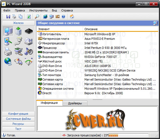 PC Wizard предоставляет обширную информацию обо всех компонентах, установленных в ваш компьютер. Поддерживаются практически все существующие процессоры, чипсеты, материнские платы, память, устройства для чтения, записи и хранения информации и т.д. Кроме того, в PC Wizard встроено несколько приложений для тестирования быстродействия процессоров, жестких дисков и CD/DVD-приводов. В программе присутствуют опции по предоставлению информации о XP SP2 Center Security (Firewall, Updates, AntiVirus Protection, Remote Ports).