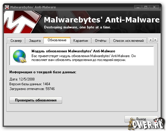 Malwarebytes Anti-Malware - программа для быстрого сканирования системы с целью обнаружения и удаления различных видов вредоносного ПО. Malwarebytes Anti-Malware ориентирована в первую очередь на борьбу со шпионскими модулями и позволяет после их удаления полностью восстанавливать нормальную работу компьютера.