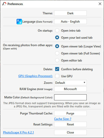 Демонстрацию результатов обработки упрощает возможность просмотра оригинала изображения в один клик на любом из этапов работы над ним. При сохранении обработанного изображения PhotoScape X Pro автоматически создаёт резервную копию оригинальной фотографии и сохраняет метаданные (отключается в настройках). Заявлена разработчиками и поддержка RAW.
